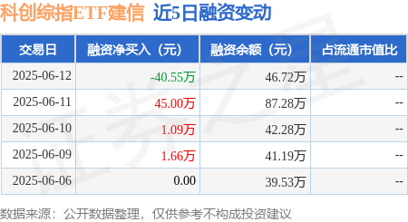 本站消息,6月12日,科创综指ETF建信(589880)融资买入4.44万元,融资偿还45.0万元,融资净卖出40.55万元,融资余额46.72万元。